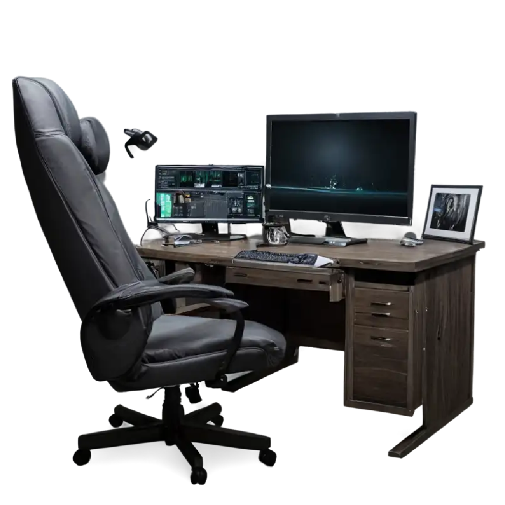Modern Office Desk Setup PNG with Chair and Monitors | Transparent Background